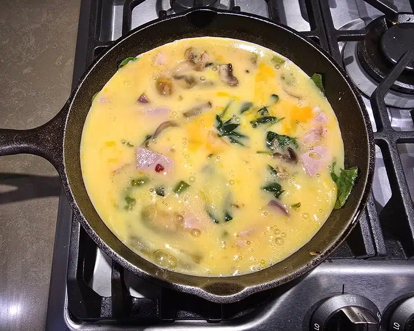 After the mushrooms and onions are cooked, add the chopped asparagus, diced ham, and bacon bits to the skillet. Stir everything together and cook for an additional 3-4 minutes until the asparagus is tender yet still vibrant. Toss in the spinach and allow to wilt.